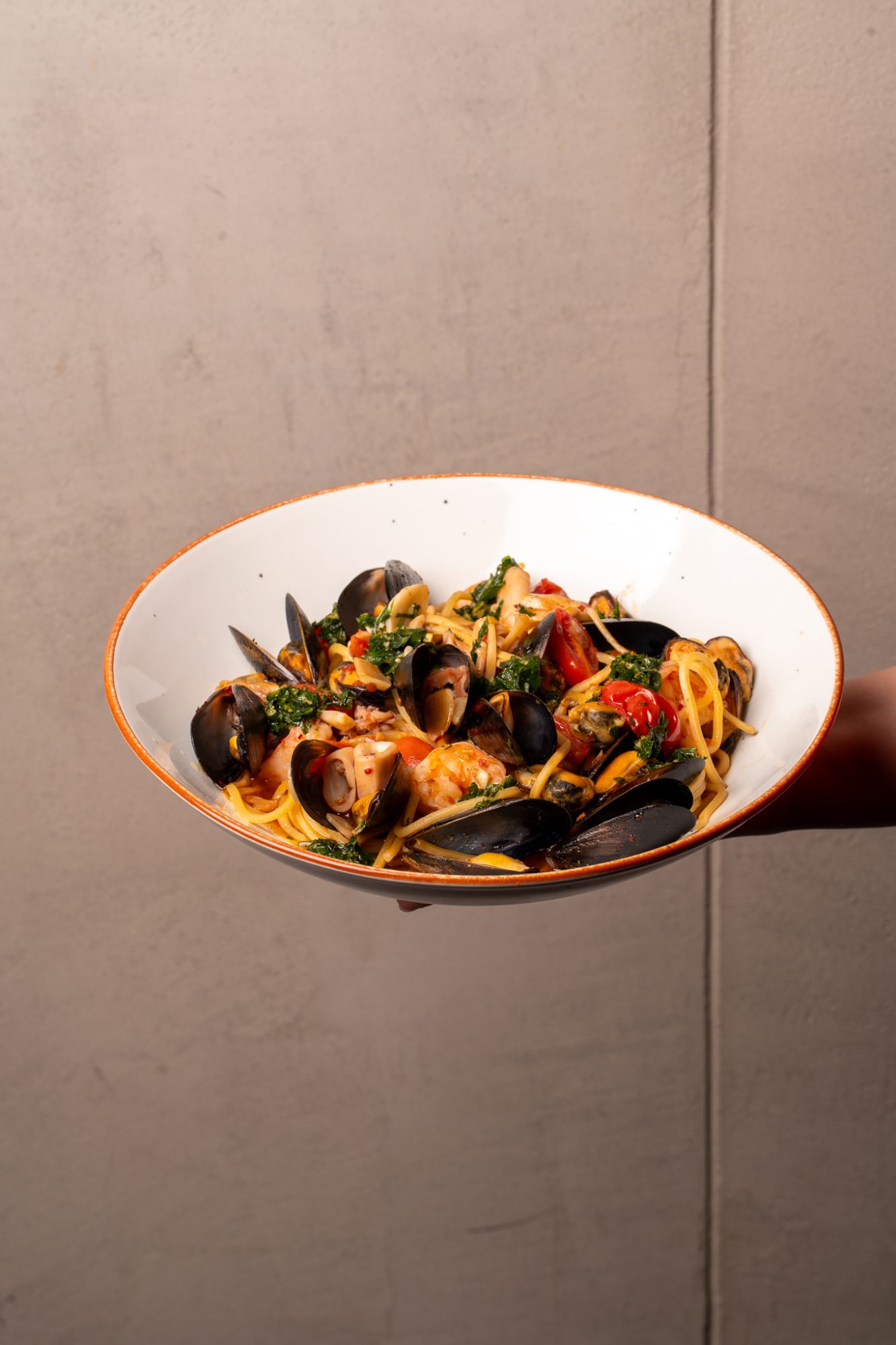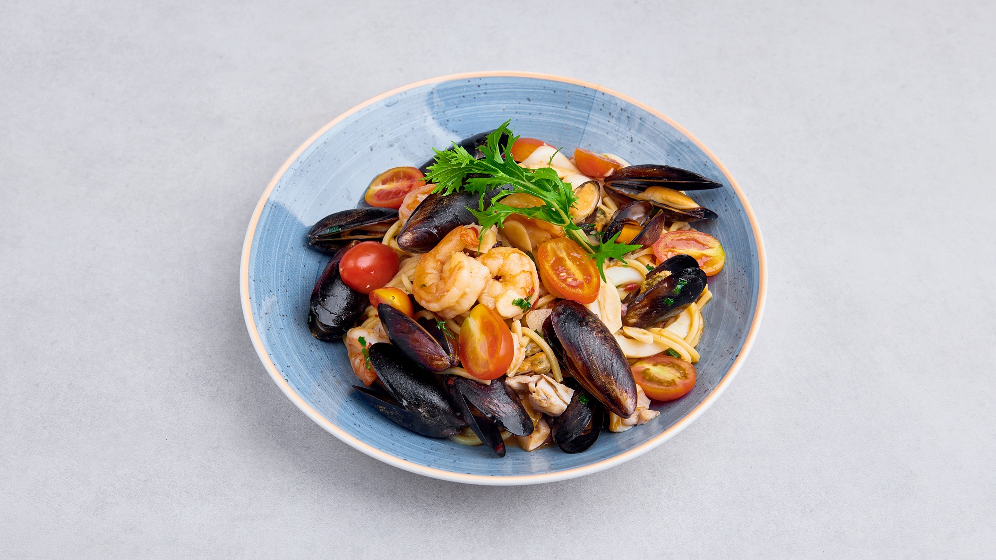 krewetki, kalmary, mule, kawałki ryb, ziemniaki i warzywa, duszone w pomidorach i białym winie, gremolata