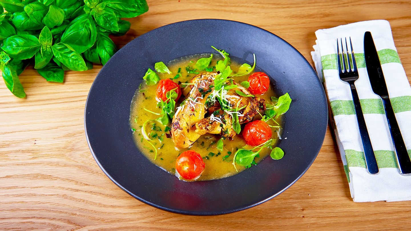 plastry piersi z indyka z szynką parmeńską i szałwia w emulsji winno-maślanej, gnocchi ziemniaczane, mix sałat ze świeżymi warzywami i pistacjami -