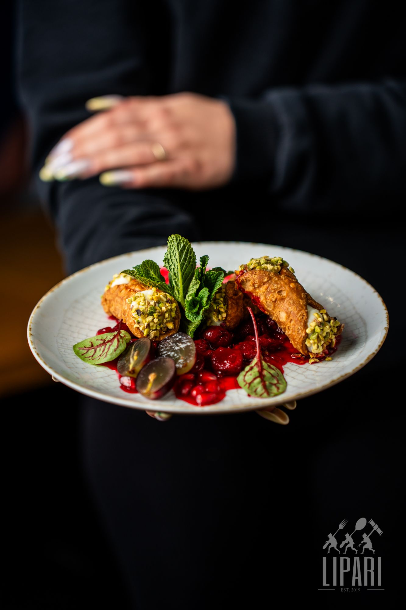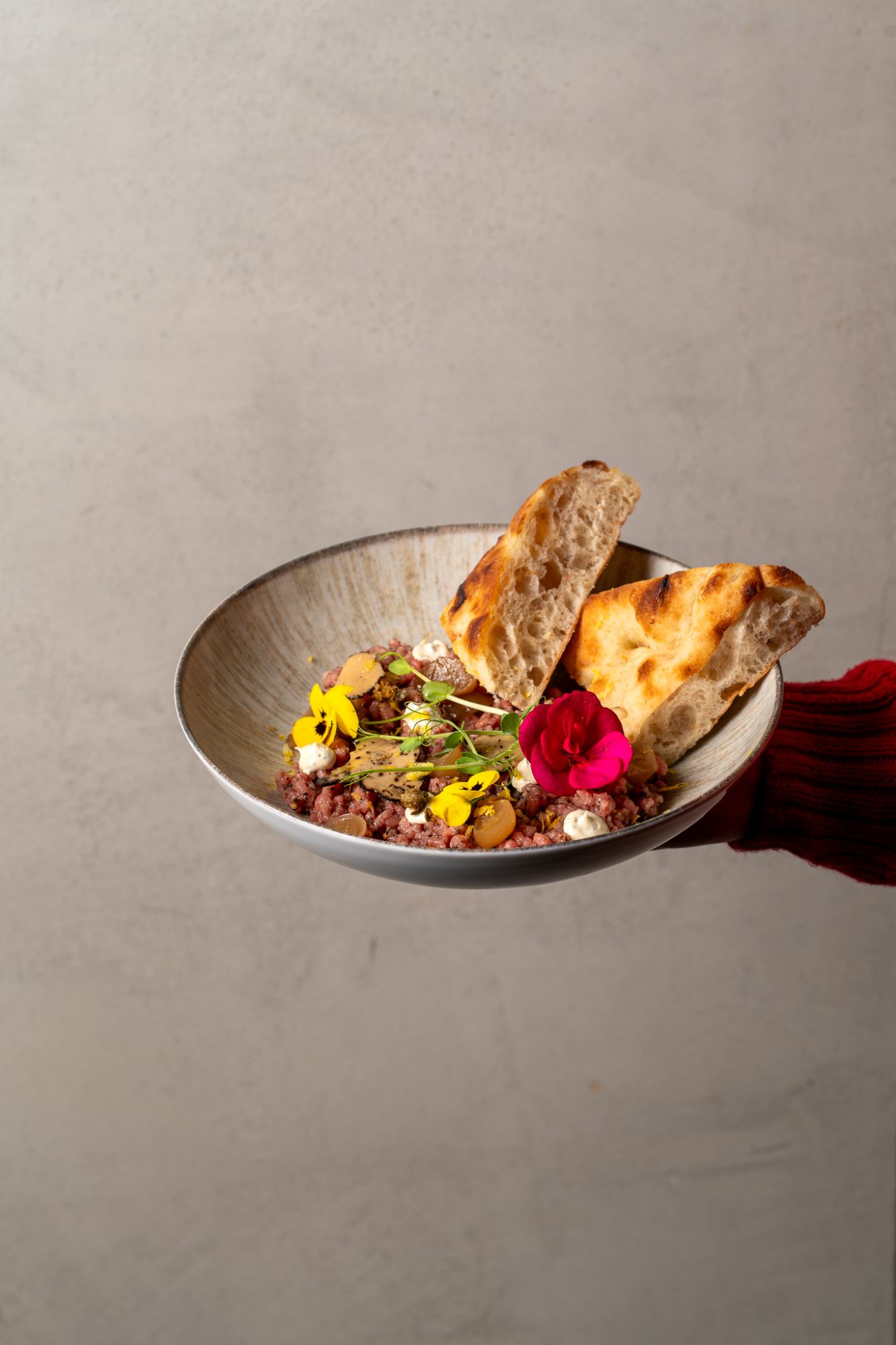 siekany łosoś, szalotka, natka pietruszki, mieta, granat, pistacje, pieczywo, dressing tahini-sumak -