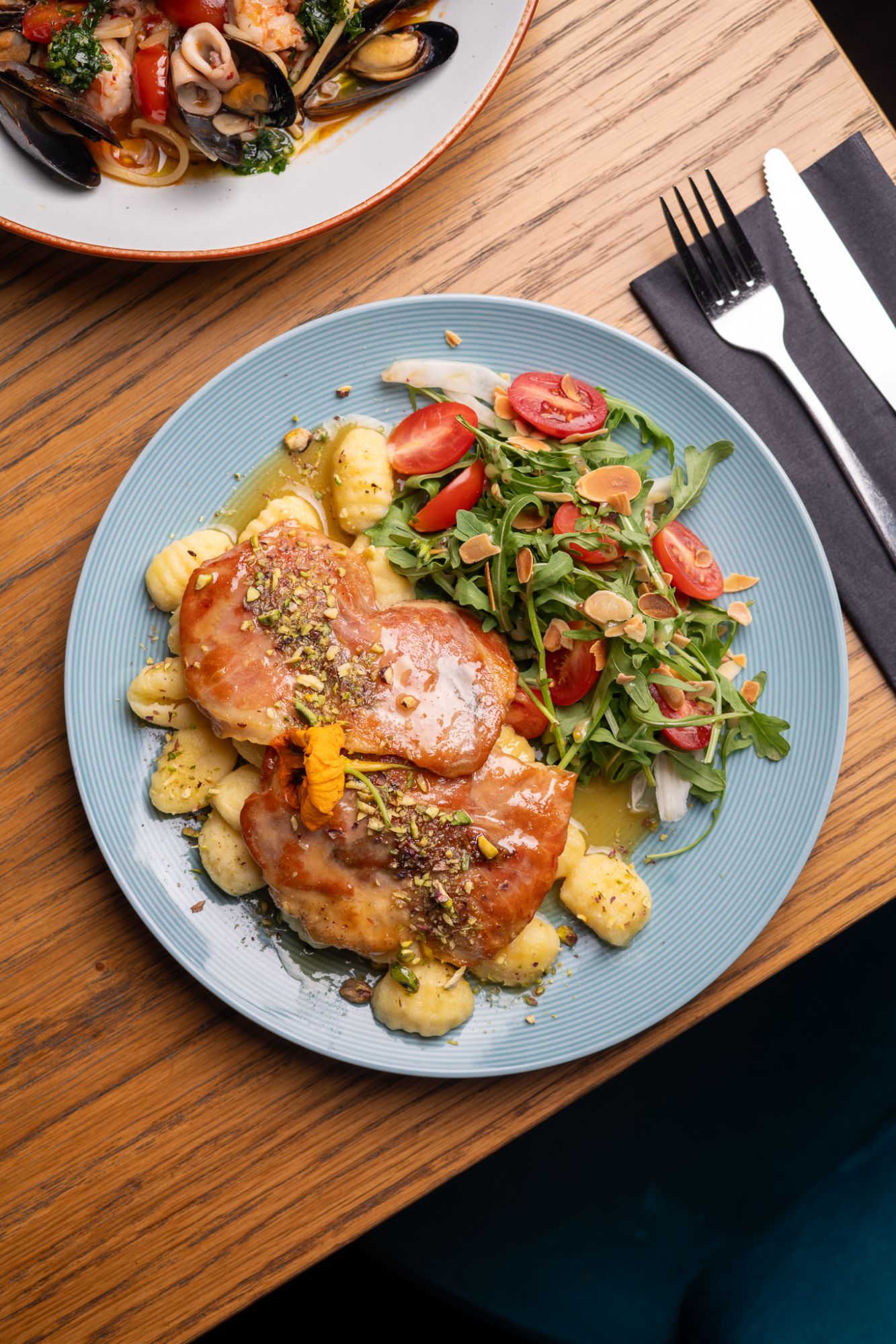 Gnocchi nadziewane kozim serem i truflami, emulsja truflowa, szalotka, czosnek, Grana Padano, rukola -
