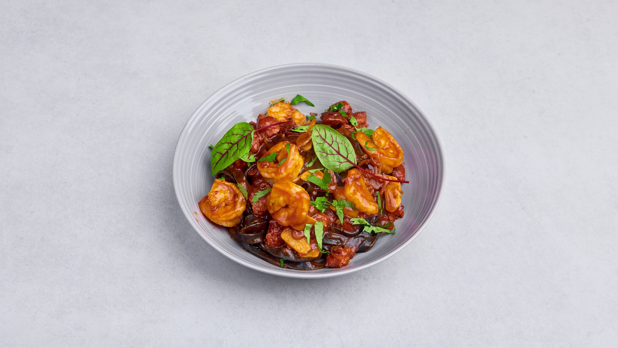 krewetki z ndują, maślana emulsja na bazie białego wina i sosu pomidorowego, oliwki, kapary, gremolata -